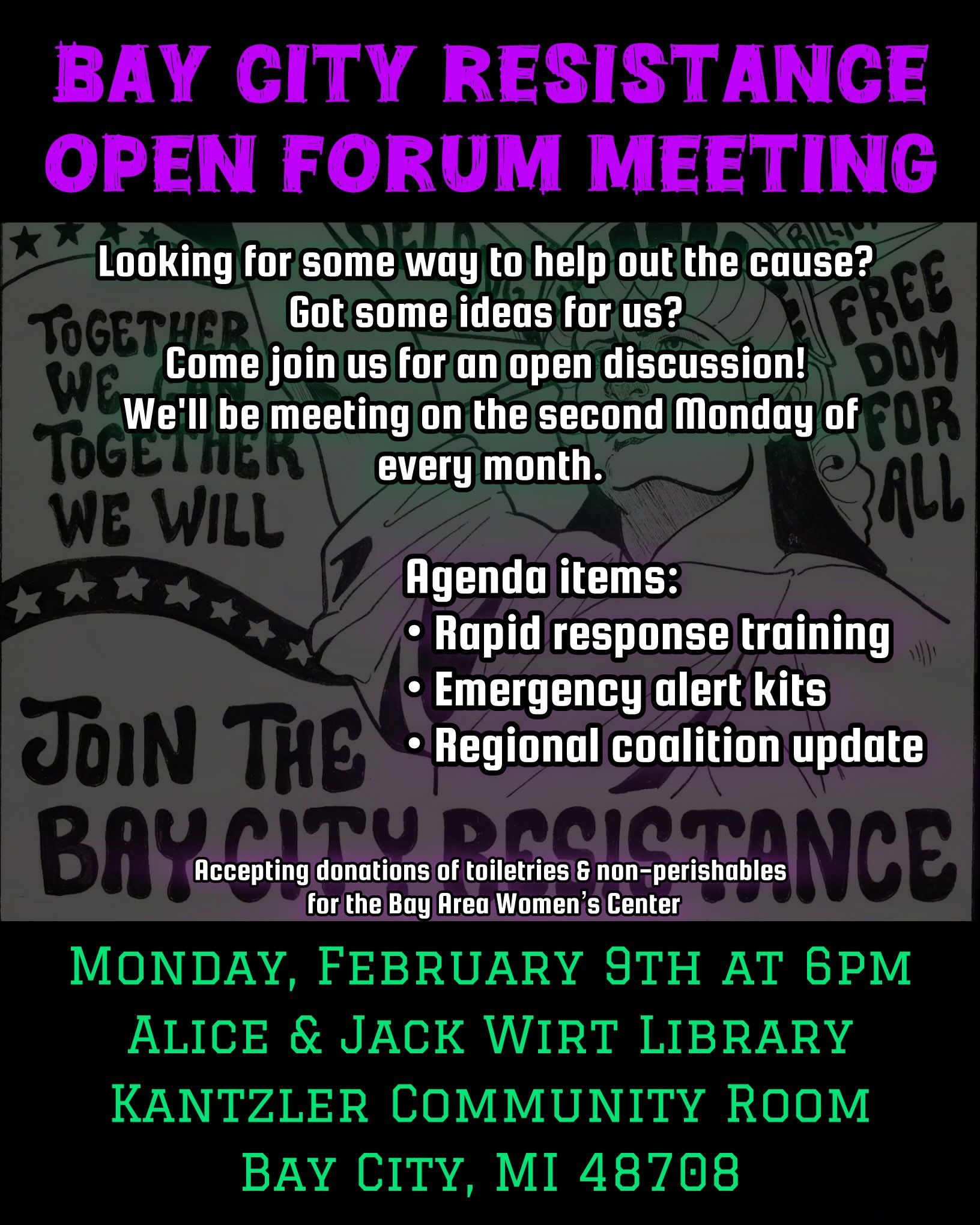 Join us for an open community forum to discuss the 50501 movement in Bay City (AKA Bay City Resistance). This is a space for collaboration, questions, and action. Whether you’re interested in volunteering, helping plan upcoming days of action, or just learning more about what’s next, all are welcome. Come share your ideas, ask questions, and be part of shaping our local movement.